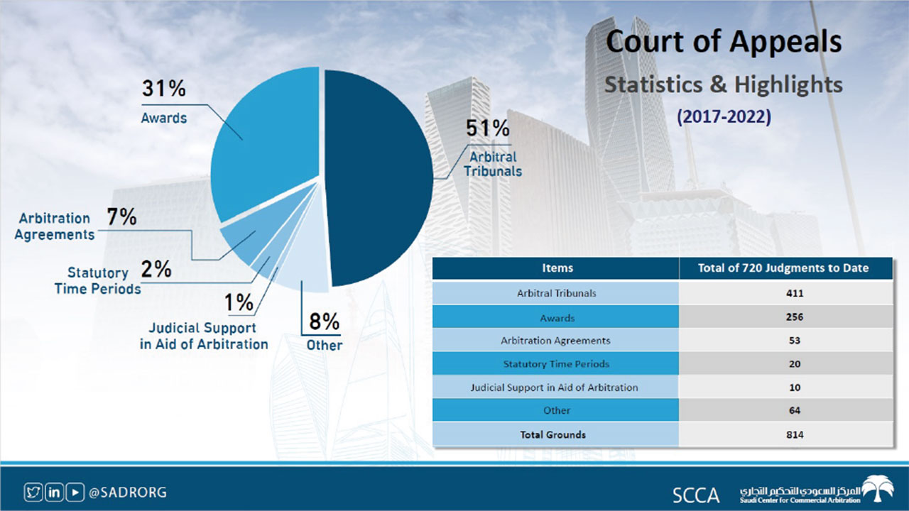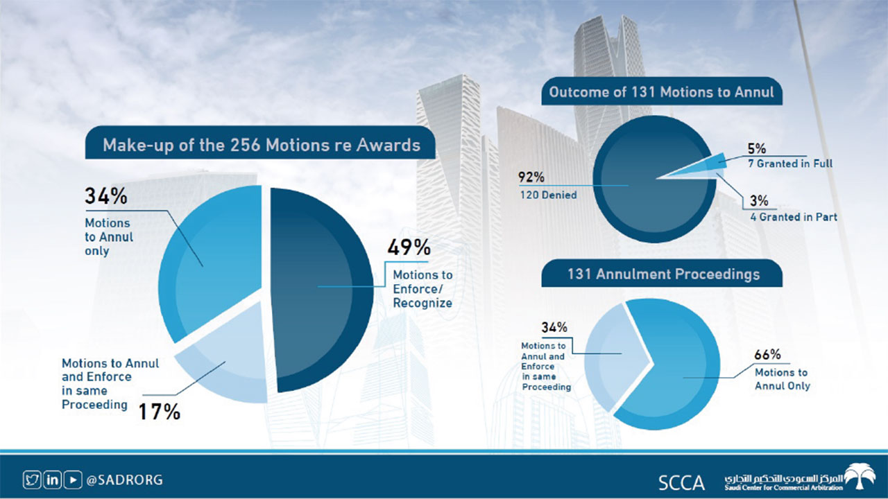 The latest SCCA study of Saudi case law, related to arbitration published between 2017 and 2022, indicated that of 720 judgments examined there were 814 grounds why a party approached the courts. Of those 814 grounds, 256 (or 31 per cent) related to motions regarding awards (both to enforce and annul). Of the 256 grounds, 131 were related to motions to annul. Of those 131, 120 (or 92 per cent) were denied, leaving an 8 per cent success rate (or 11 motions). Of these 11 motions, seven were granted in full and four only in part. Of the 24 sharia grounds identified, only five were successful (or 21 per cent).